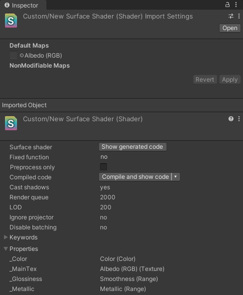 在这里我们可以设置着色器使用的默认纹理图片,第一次使用该Shader时,这些纹理会自动的赋予到对应的属性上。