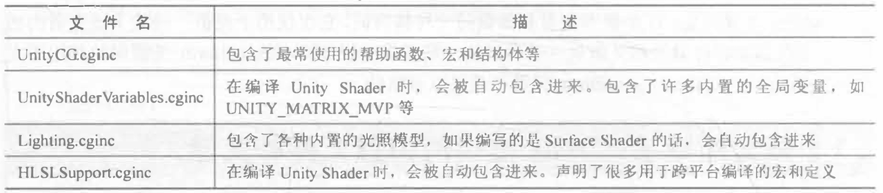 在编写 Shader 时,我们可以使用#include 指令把这些文件包含进来,这样我们就可以使用Unity为我们提供的一些非常有用的变量和帮助函数。