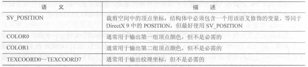 ==在 DirectX 10 以后,有了一种新的语义类型,就是系统数值语义(system-value semantics)。这类语义是以 SV 开头的,SV 代表的含义就是系统数值(system-value)。这些语义在渲染流水线中有特殊的含义。==