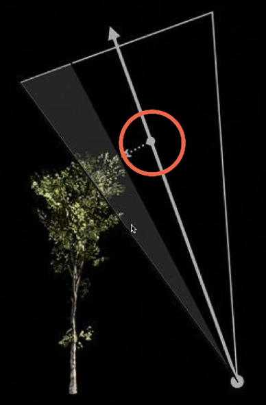 我们知道SDF会产生一个安全距离,比如下图中找到一个点往外射出一条光线,任选一个点,该点处会有自己的SDF,能找到与最近的遮挡物体的距离。而从光源处,到这个SDF的极限距离的点,会产生一个角度,被称作为安全角度。我们反向思考,如果安全角度越小,意味着这个地方被阴影遮挡的越严重,也就是越暗,因此就可以用这么一套思路来生成软阴影。