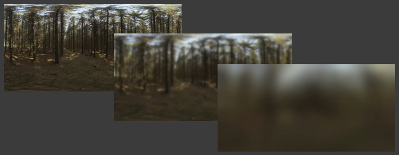 我们将不同滤波核处理环境光信息贴图生成一系列模糊过的图,当我们需要时进行查询即可。如果我们需要的滤波核不存在,也可以通过在这些已生成的通过三线性插值得到。