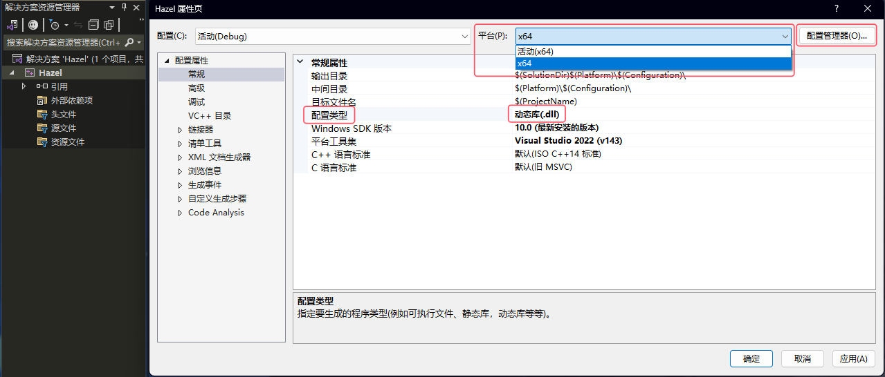 右键Hazel解决方案(这是一个新建的C++空项目),在配置管理器中将平台设置为x64(将win32x86删除),并且将配置类型修改为动态库dll的方式。