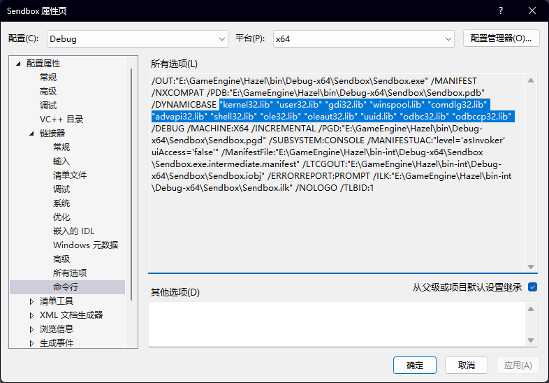 在解决方案管理器中我们新建一个C++空项目,命名为Sandbox,此时打开Sandbox的属性,会发现它创建了自己的属性,我们需要打开属性按照上一步的方法将win32x86的配置删除,同时配置输出目录和中间目录。对于配置类型,我们使用exe即可。同时右键,我们将Sandbox设置为启动项目。