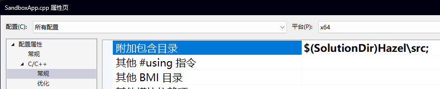 在Sandbox的属性中附加包含该目录,这样我们也可以使用#include”Hazel.h”了
