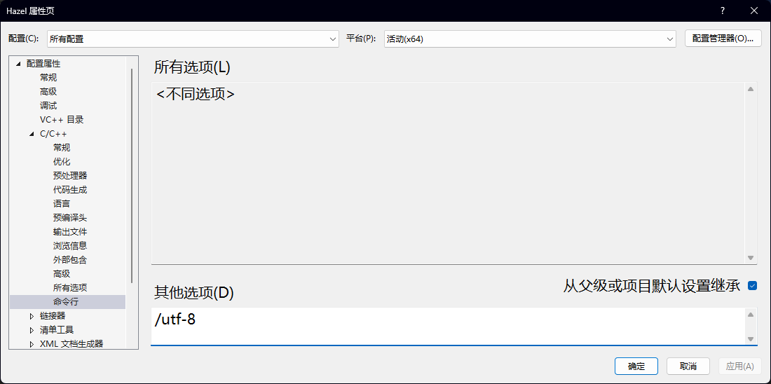 在Hazel的属性中其他选项增加/utf-8即可(此时之前的中文可能会乱码)