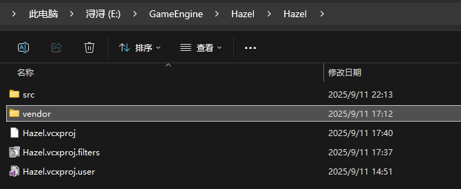 首先我们在项目首页创建一个vendor文件夹,这个vendor文件夹和Hazel里面的vendor不一样,里面的vendor文件夹仅是她所需的东西,这些和我们的资料无关,而是在整个解决方案中所需要的。