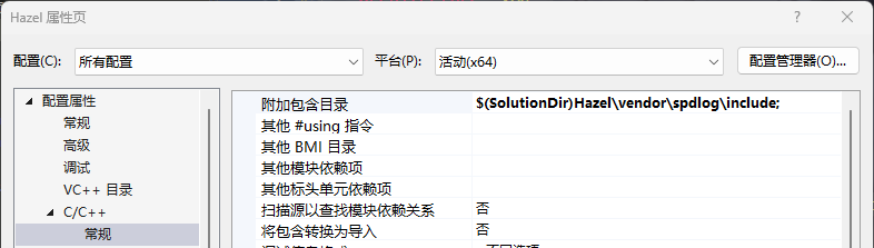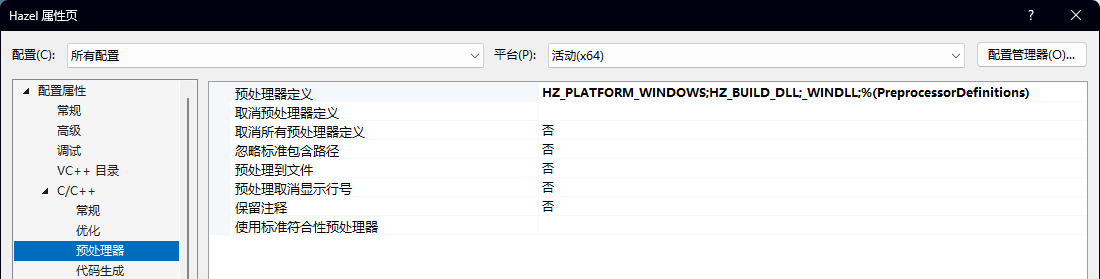 在Project下面,我们需要放入一些属性中的内容,比如我们的预处理器等。但是此时我们要注意到,Project “Hazel”这个实际上是我们在解决方案Hazel目录下的一个Hazel,所以我们需要确定路径,使用location "Hazel"。