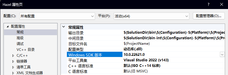 写到这里,我们可以发现被设置为Hazel,然后需要配置64位操作系统,并且会有三个分别为”Debug”,”Release”,”Dist”,分别是调试,比调试更快的一个版本,完整的发行版。