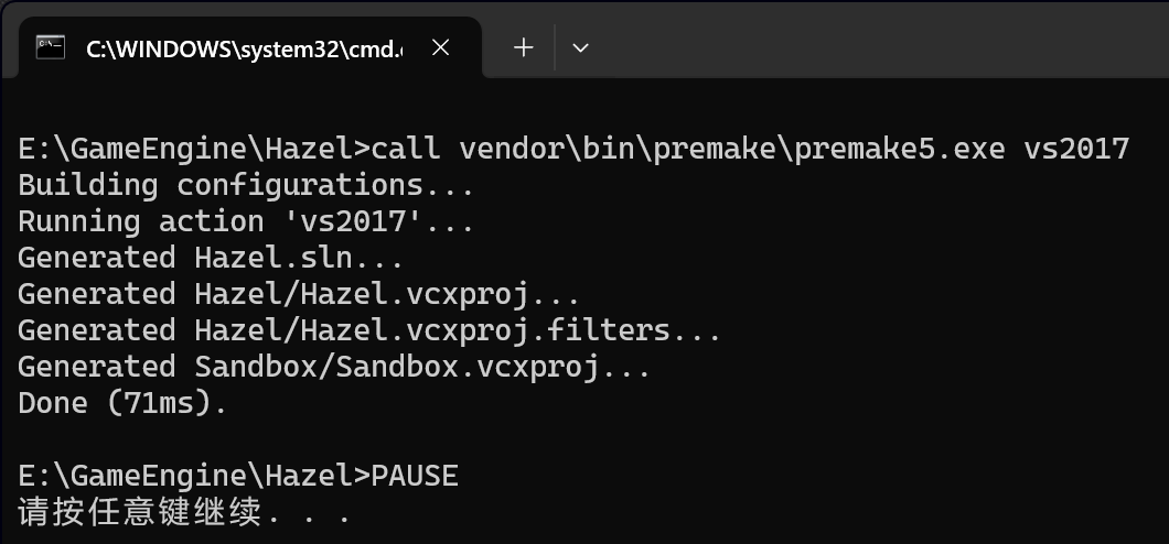 在Hazel工程中船创建一个GenerateProjects.bat批处理文件,内容为: