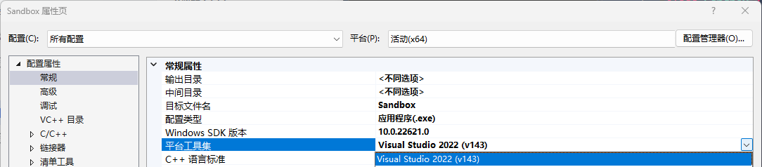 问题三:超级难绷的构建问题,因为本文是跟着教程走的,貌似可能是因为Premake选择的版本比较低,无法构建vs2022版本的,所以是构建2017然后升级为2022,会报错工具v141的bug,这个时候打开属性,点击平台工具集就行
